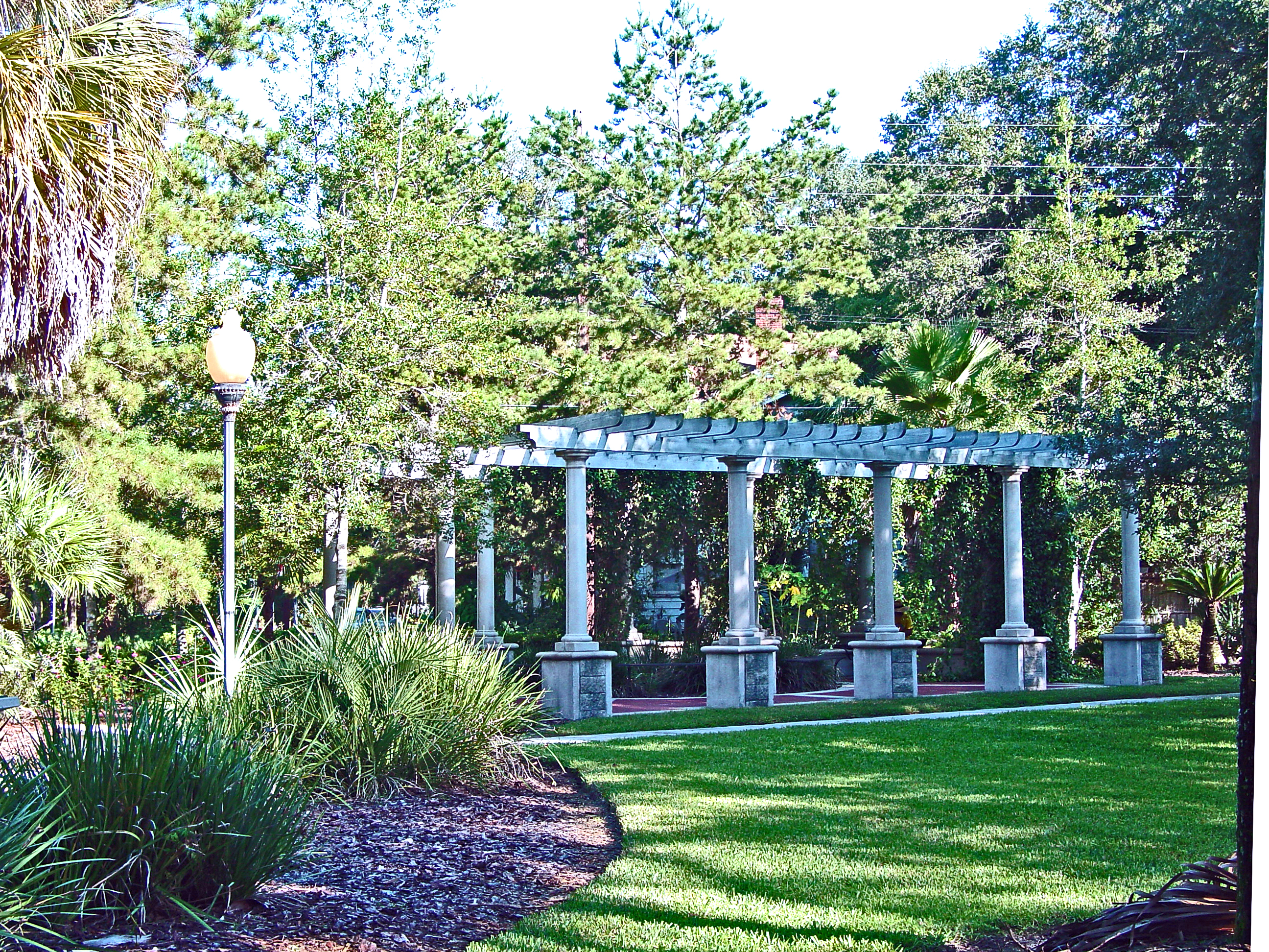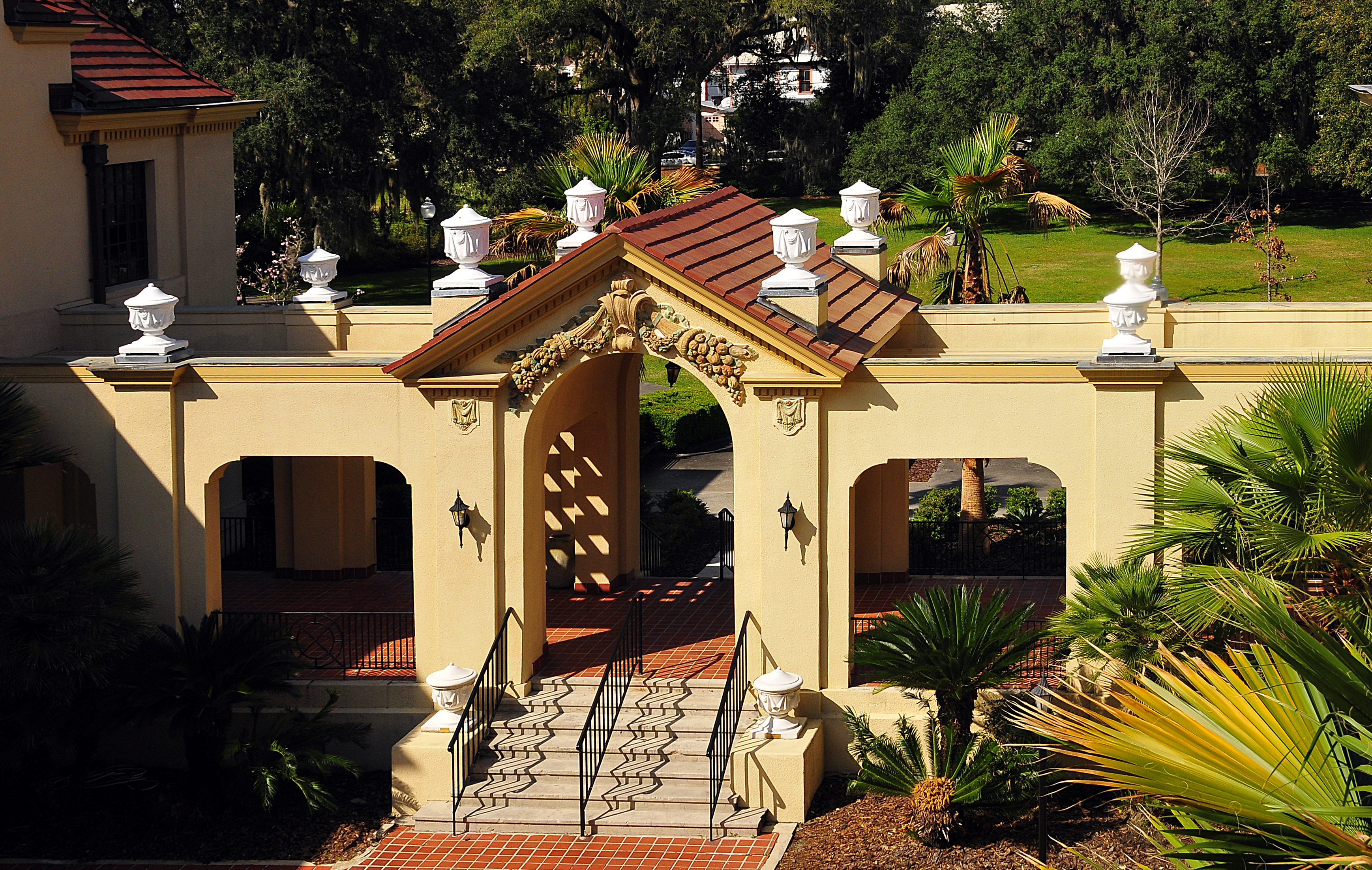 From season to season, the gardens of the historic Thomas Center provide a cool oasis to escape summer’s heat, as well as sunny areas to escape winter’s chill. Varied plantings herald the change of the seasons. Colorful camellias brighten our mid-winter, followed by the blooming azaleas of early spring. Next, come the dogwoods of late spring with their white blossoms. Finally, beautiful roses usher us into summer. Throughout the gardens, ferns and palms provide a greenery backdrop to majestic live oak and magnolia trees.